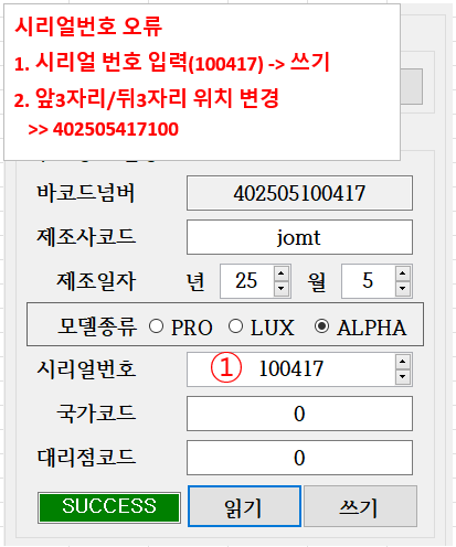 2. Duaslsonic(PRO,LUX,ALPHA) 본체 제품 시리얼 번호 쓰기 오류   ->  시리얼번호 입력란의 끝 3자리 와 앞3자리가 변경 입력(정상)  ![image.png](/attachments/b4669b35-2f5c-4c35-991b-d48d5e9ad950) 본체 시리얼 번호 정렬 수정
